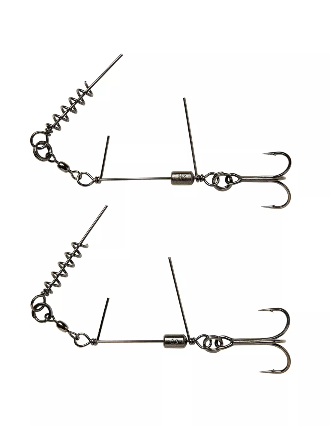 “Perfecte corkscrew-stingers, met roestvrijstalen draad en wartel, voor de perfecte duurzaamheid en sterkte. Rechte spikes, voor perfect vasthouden en loslaten. 3g lichtmetalen buikgewicht, voor de perfecte balans met grote shads. Verkrijgbaar met verschillende haakmaten.
