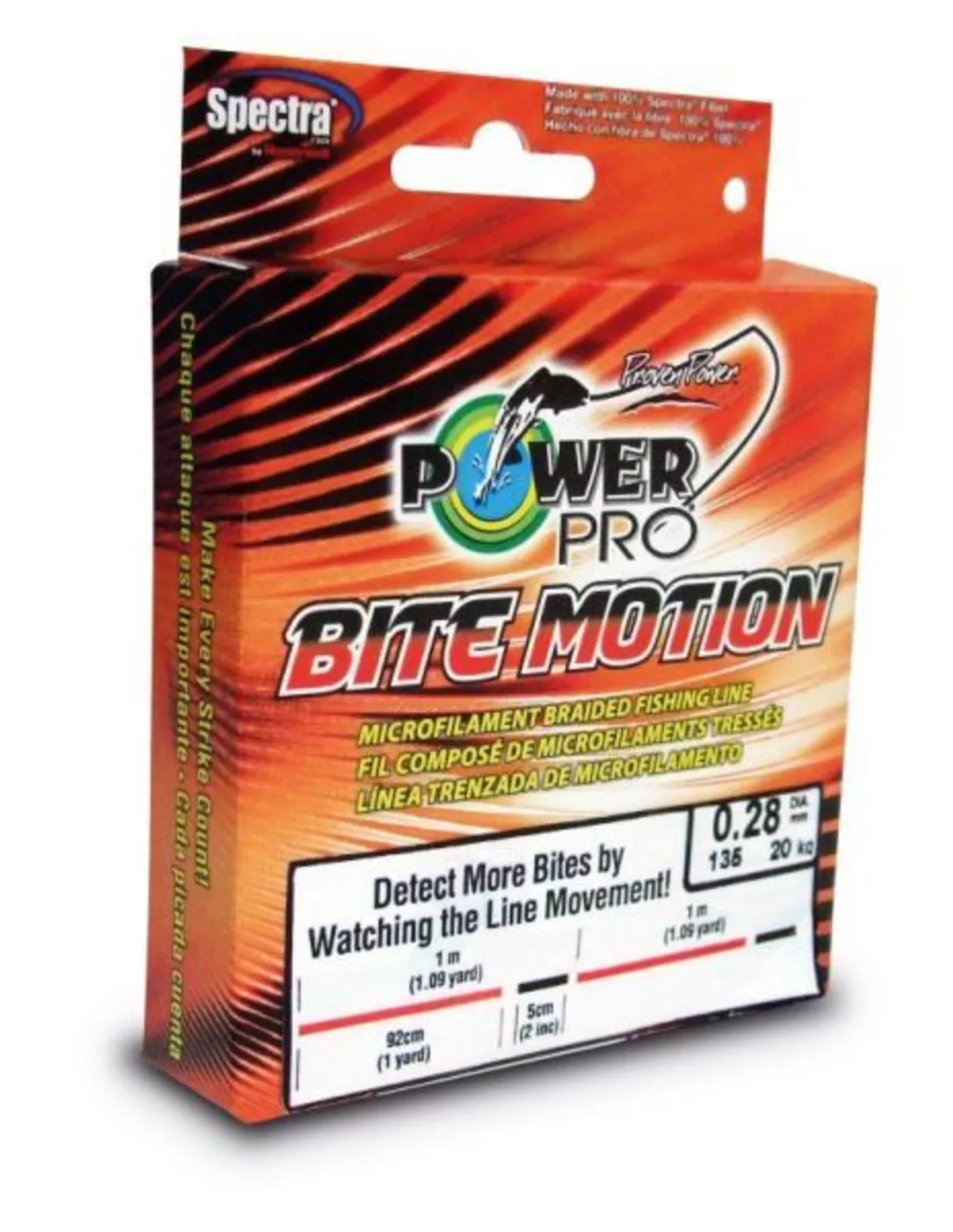 PowerPro Bite MotionMet PowerPro Bite Motion kunt u aanbeten zien bij beweging van de lijn. Bite Motion is voorzien van speciale zwarte markeringen die alshet ware als beetverklikker fungeren.U ziet een mogelijke aanbeet al bij het afzinken van het aas , zodat u snel kunt reageren op aanbeten die u anders nooit had gezien.Perfecte lijn voor het snoek, baars en snoekbaars vissen.